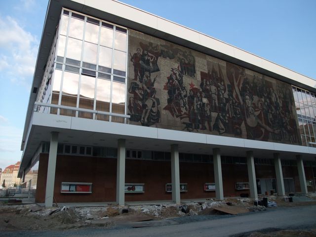 東ドイツ時代の建物 壁画には共産党時代の赤い星、ソビエトの鎌などが描かれています。