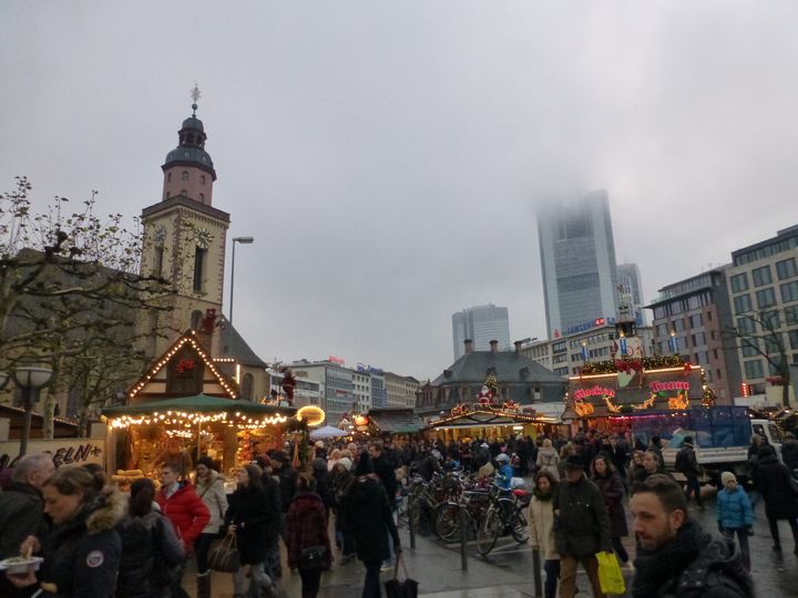 帰路で見たカタリネン教会前のクリスマスマーケット。 ハウプトバッヘも見えます。 高層ビルは雲の中です。