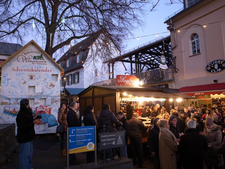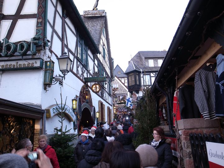 バスでリューデスハイムへ。まずはアウトバーンを走りました。途中からやっと晴れました。またちょっとだけですがライン川沿いを走ってくれたので以前ライン川下りを舟で楽しんだ景色を再び見ることができました。そして4時過ぎにリューデスハイムへ。まだ夕方であたりの景色を見ることができました。すぐに段々暗くなりました。 ここではつぐみ横町を通ってワイン倉へ。そこでアイスワインとキフワインを試飲。その後は通りに出てクリスマス時期のマーケットを楽しむ時間となりました。滞在時間は2時間弱。帰りは真っ暗。見物を終えるとバスで約1時間かけてフランクフルト空港へ。 8:25PM発のJL408便で成田へ向かいました。機内泊。 翌日の12/16午後4時過ぎに成田に戻りました。