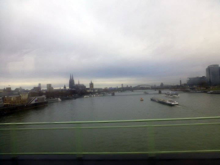 ライン川に架かる橋の上のバスからケルンの大聖堂を望む。