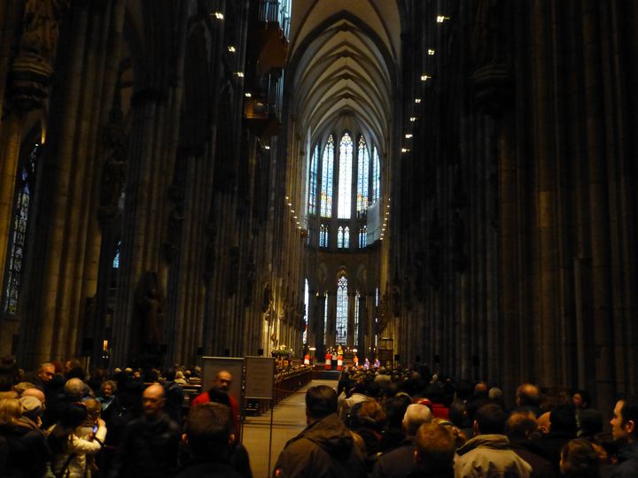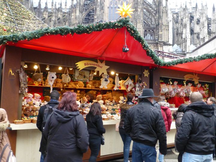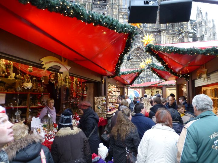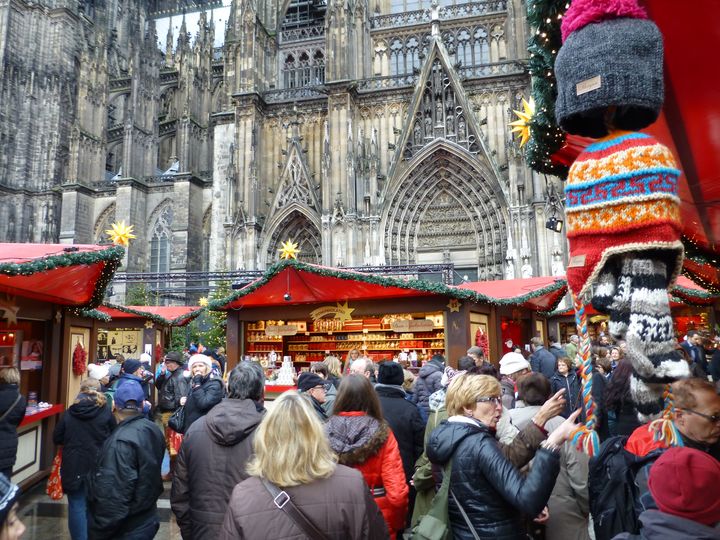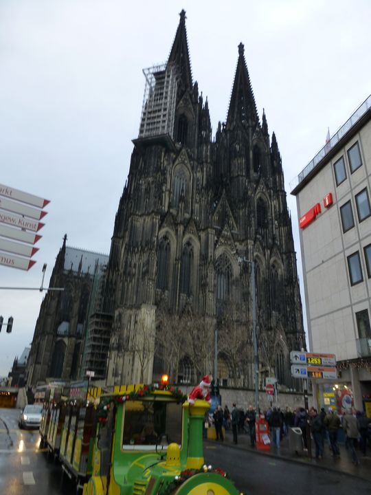 朝8AM バスでフランクフルトを出るときは霧雨。アウトバーンを走り、ケルンへ。11時頃ケルンへ。ライン川を渡って、大聖堂近くで下車。 大聖堂をちょっとだけ見物。その後その脇の広場で開かれていたクリスマスマーケットを訪問。30分ちょっとで見てしまったので、以前お菓子を買ったことがあるカフェへ。ここで時間を過ごしました。滞在約2時間。またバスに乗りリューデスハイムへ。