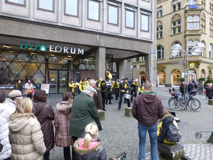 広場では楽隊が演奏していました。 うしろの右の角のカフェで休んでいました。