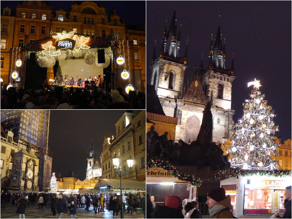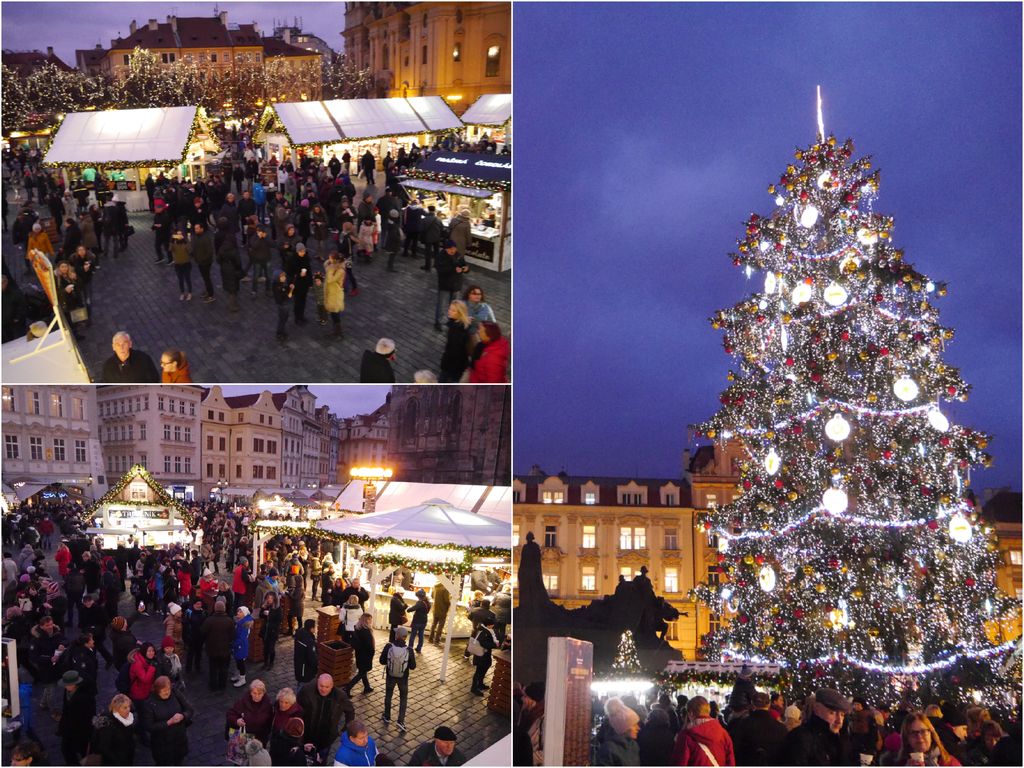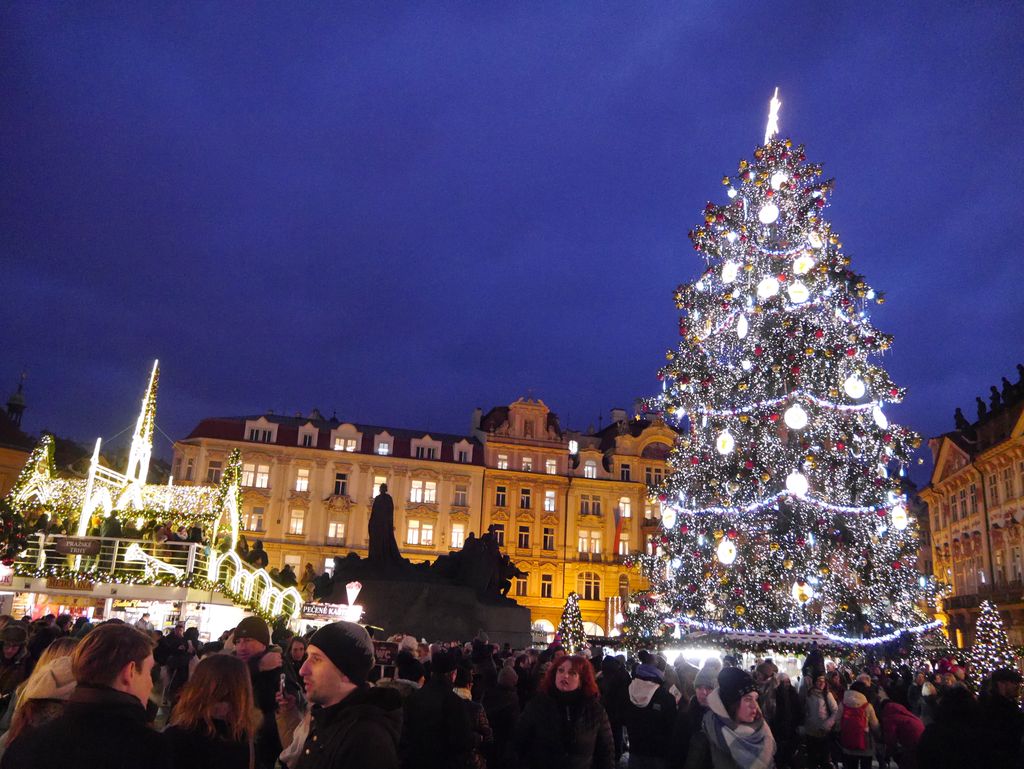 旧市庁舎の時計 仕掛け時計になっています。 この仕掛け動作を見ました。 旧市街広場にクリスマスマーケット。 立派なツリーです。