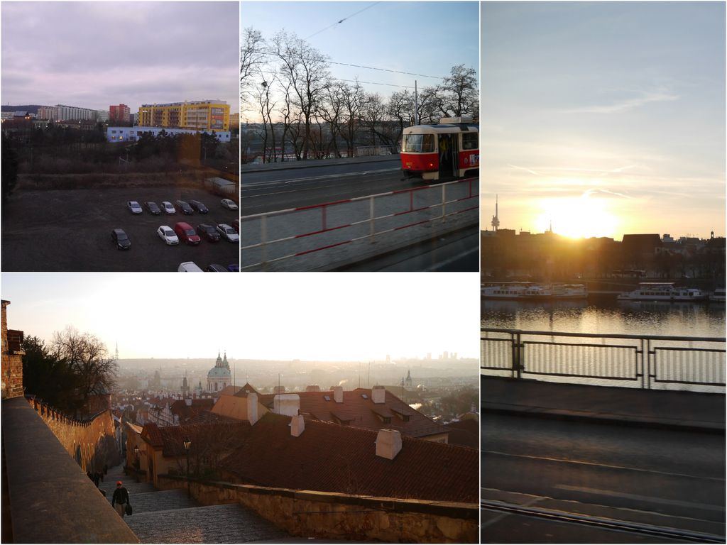 12/7朝 ホテル(左上の写真)を出発 プラパ城のある丘に登るとき朝日があがってきました。 朝のお城から見るプラハ野町の風景です。