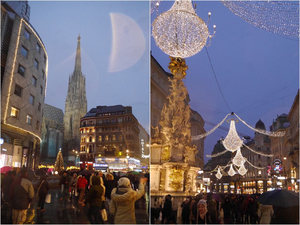 美術史博物館の訪問を終え、その後 再び夕方 グラーベン グルントナー通りを歩いて観光 この時間は電飾も輝いていた。残念なのは雨。