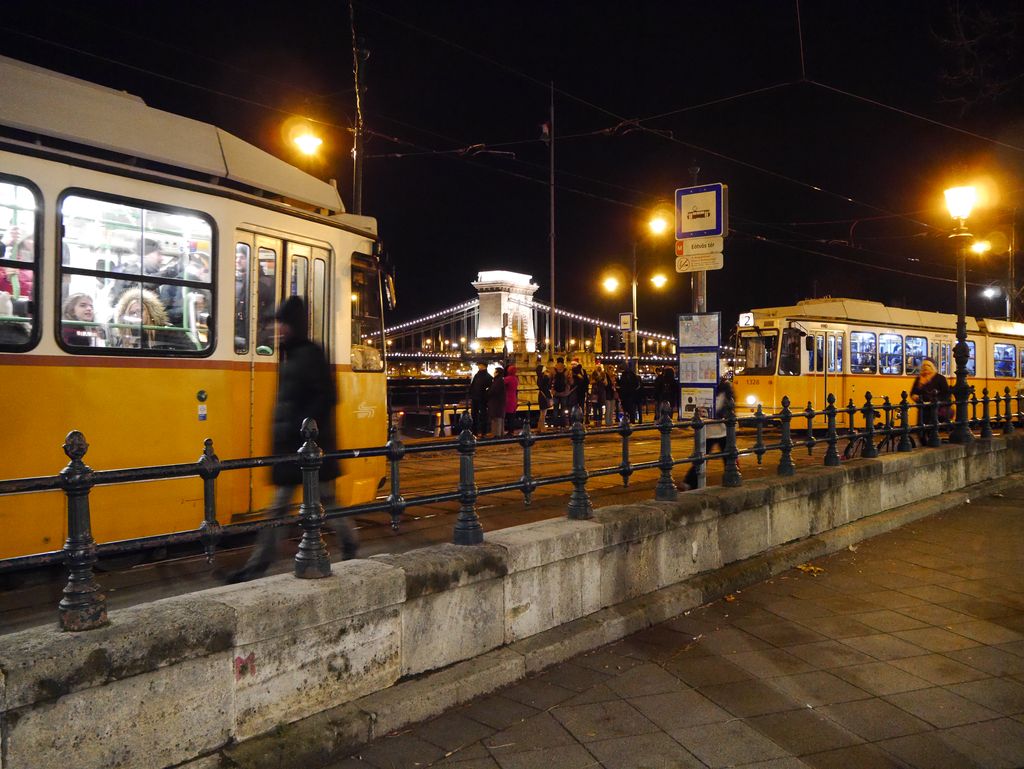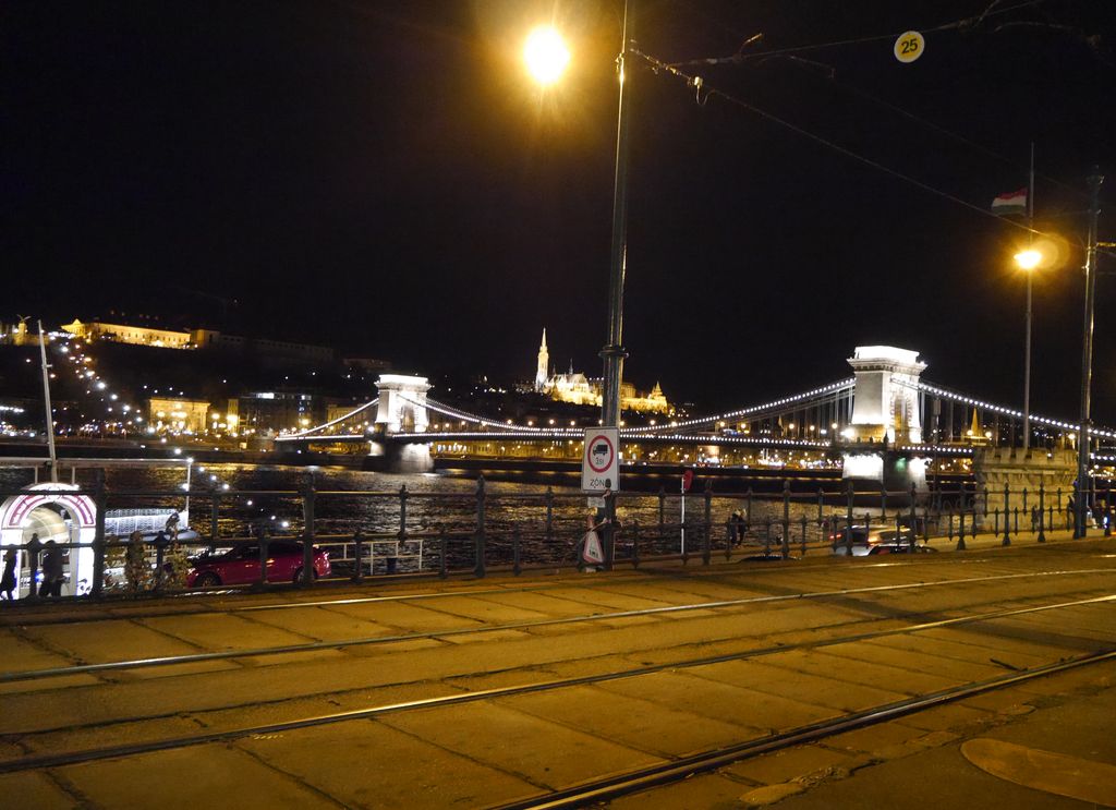 クリスマスマーケット見物後、ドナウ川ほとりのホテル前ツアーバス待ち。そのとき見た風景 王宮とドナウ川、 漁夫の砦とくさり橋 そして電車の風景