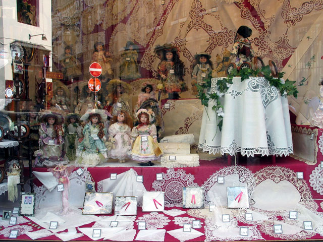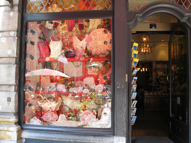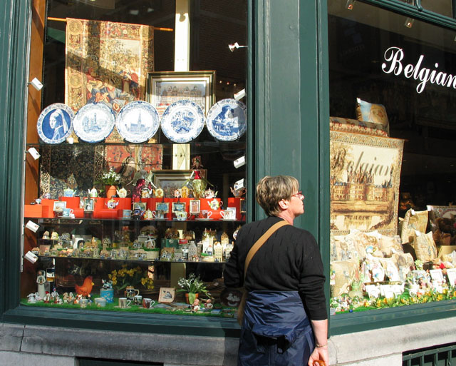 このグランプラス界隈のおみやげ屋さんのショ−ウインドウです。デルフト焼きとレースなどを売っていました。