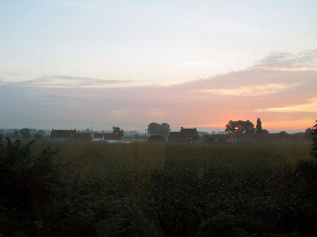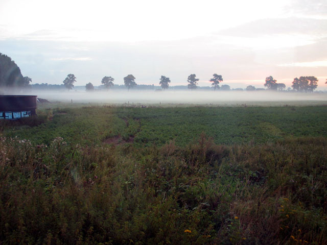 この写真はブリュージェからの在来線列車から見た朝靄の風景です。