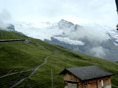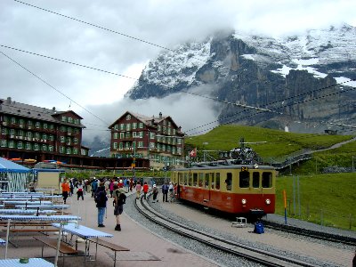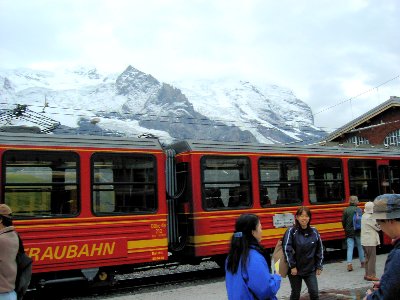 高い山々を見る行動です。雨の中電車を途中で乗り継ぎ、ユングフラウを見るためにアイガーの北壁に