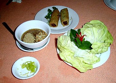 薄い皮が小皿にあり、スプーンで皮を起こして包んでいただきます。 揚げ春巻きを野菜に包んでいただきます。