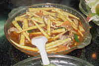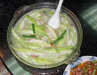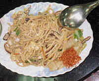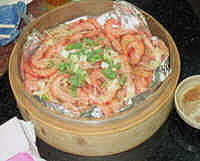 エビ料理 (日本では見たことがない種) めん料理 もつ鍋(からしと香菜がいっぱい)