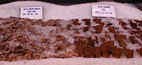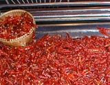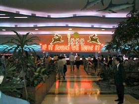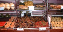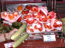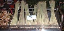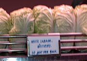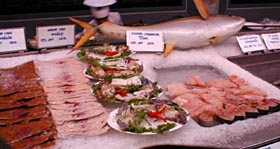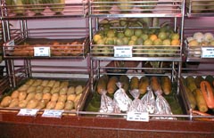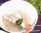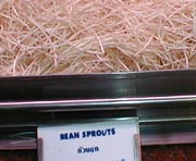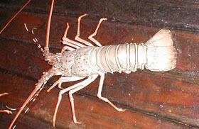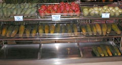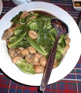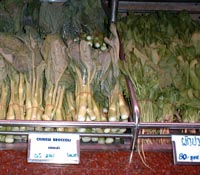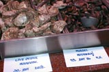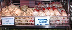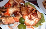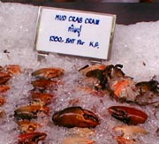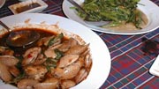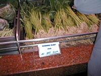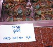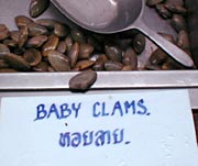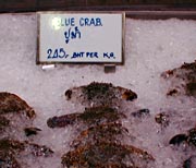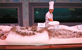 深夜の帰国前のディナーです。多くのコックがいます。また、奥には 料理の材料が並べてあります。これを買ってこの場で料理をしてもらいます。 ここは前回も来ましたがおいしいところです。素材名がタイ語と英語で 表記されています。 材料です。 エビ エビ(ぞうり) できた料理の一部です。 戻る。